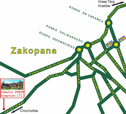 - Samochodem – jadąc „Zakopianką” z Krakowa przy wjeździe do Zakopanego na pierwszym rondzie (rondo Chramca) prosto (kierunek na Chochołów), na drugim rondzie (rondo Solidarności) również prosto, a na trzecim rondzie (rondo Dmowskiego) trzeba jechać w lewo i główną drogą (ok. 3 km). Klasztor znajduje się ok. 700 m za Sanktuarium Matki Bożej Fatimskiej po prawej stronie ulicy przed przystankiem PKS.